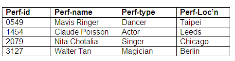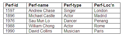 In the relation Performer-details above, we can see that all performer information is stored and can be accessed by the performer-id attribute, and all agent information can be extracted by means of the agent-id attribute.
