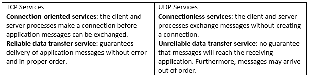 The Internet or TCP/IP network provides two transport-layer protocols that can be used by the application layer, namely Transmission Control Protocol (TCP) and User Datagram Protocol (UDP). Each protocol provides services to applications in the application layer. The table below lists some of the services offered by both protocols. More details of these protocols will be discussed in the next chapter.